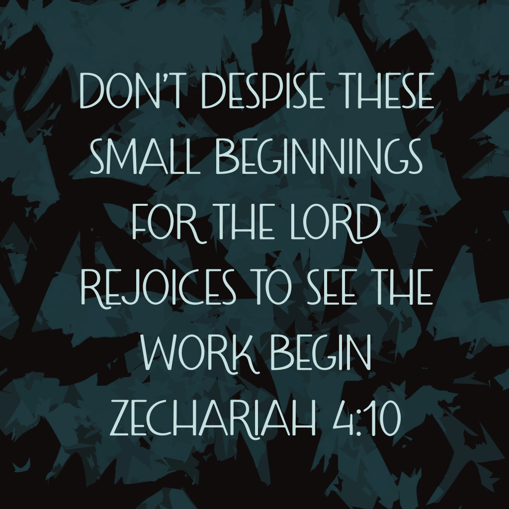 Zechariah 4:10 NLT says “do not despise these small beginnings, for the Lord rejoices to see the work begin.” You may not like where you’re at right now and wish you could already be at that finish line. Trust me, I get that. I wish that a lot. But God loves the small beginnings. He loves the little steps that get you started. He loves to see the work begin. He has great purpose in it.