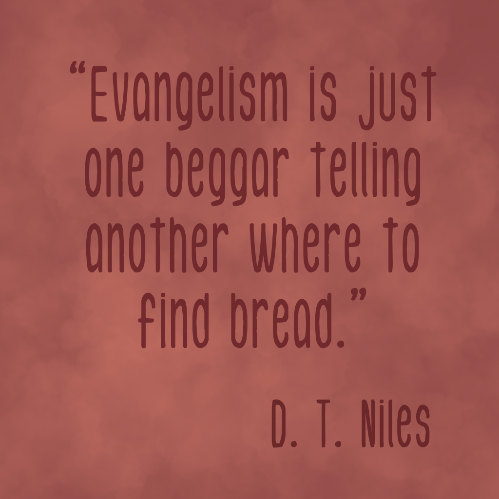 One of my favorite quotes about this is by D. T. Niles who was a preacher, evangelist, and author. “Evangelism is just one beggar telling another where to find bread.” And that’s it. We couldn’t save ourselves. And we can’t save anyone else ourselves. We start off needing someone else to show us where to find salvation. And then we can show others where to find it. It’s freely given and always in full supply.