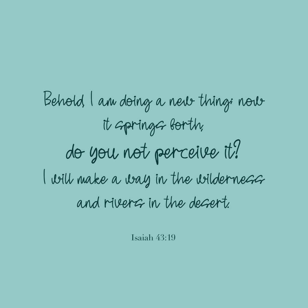 “Behold, I am doing a new thing; now it springs forth, do you not perceive it? I will make a way in the wilderness and rivers in the desert.” Isaiah 43:19