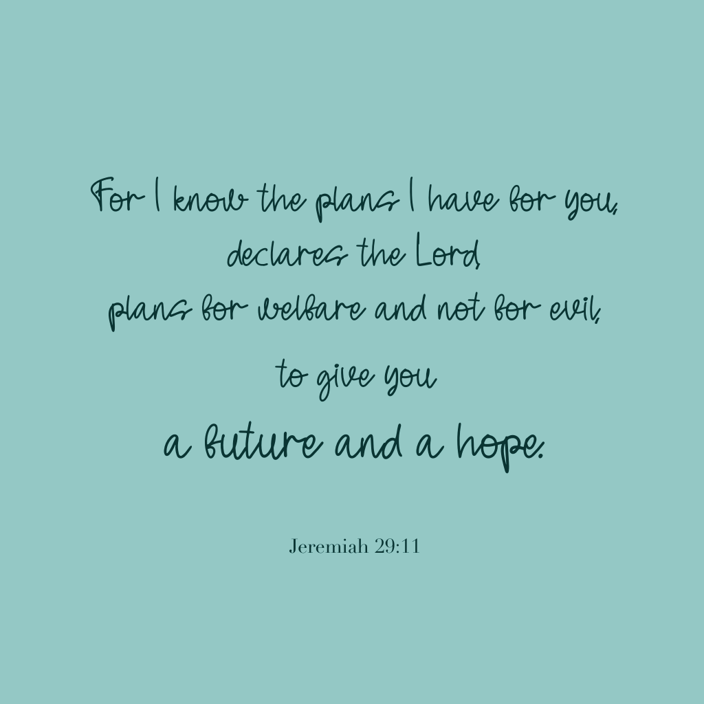 “For I know the plans I have for you, declares the Lord, plans for welfare and not for evil, to give you a future and a hope.” Jeremiah 29:11